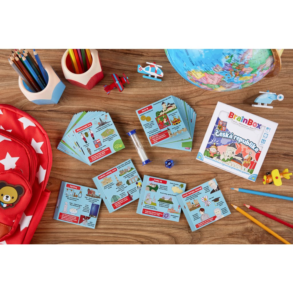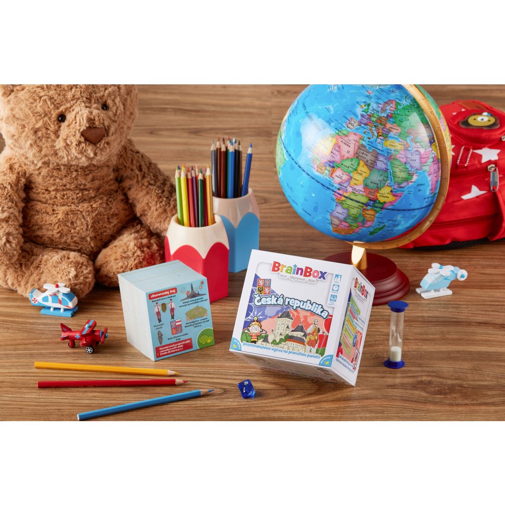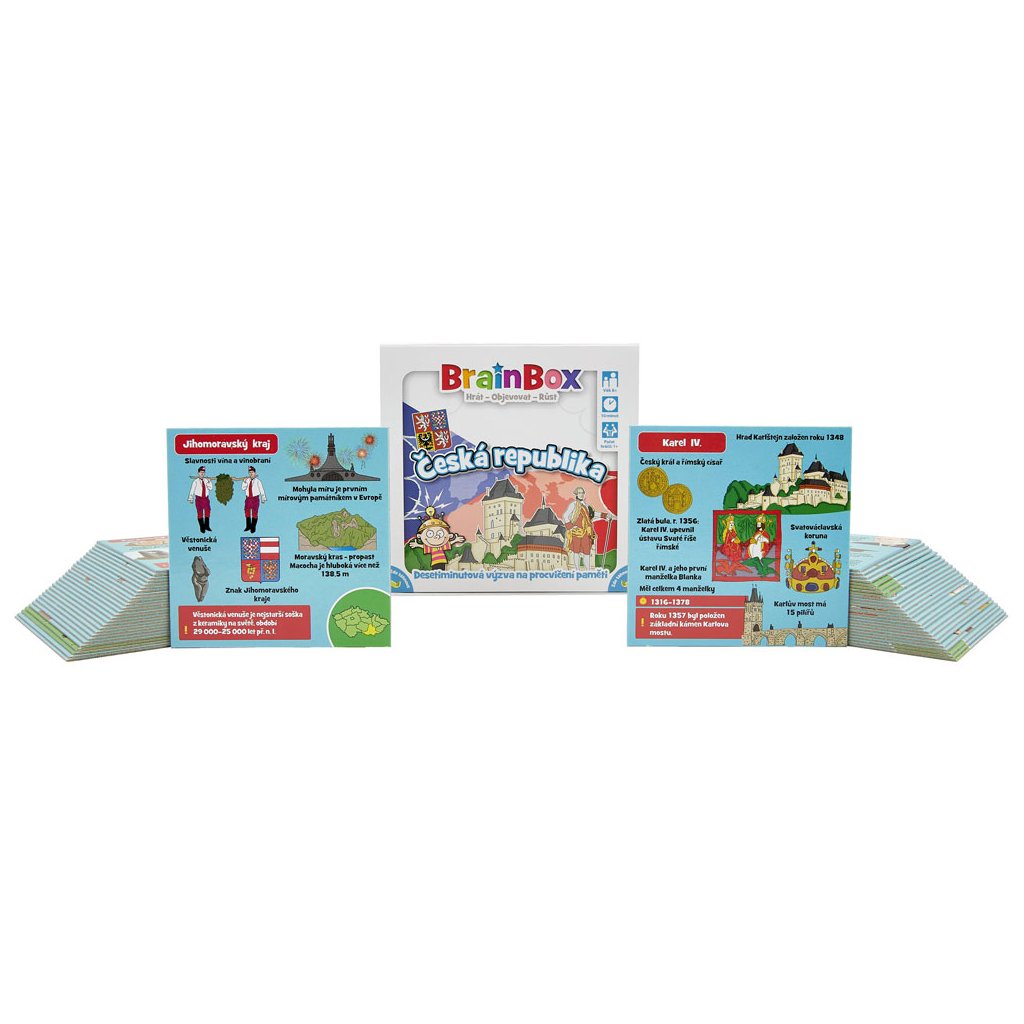 BrainBox Česká republika obsahuje 55 karetních her, z nichž každá představuje nějaký kraj, národní park, významnou oblast nebo osobnost naší země. Na každé kartě jsou údaje o kultuře, zajímavých místech, historii a lidech této oblasti - díky ručně ilustrovaným obrázkům vám vše ožije doslova před očima.