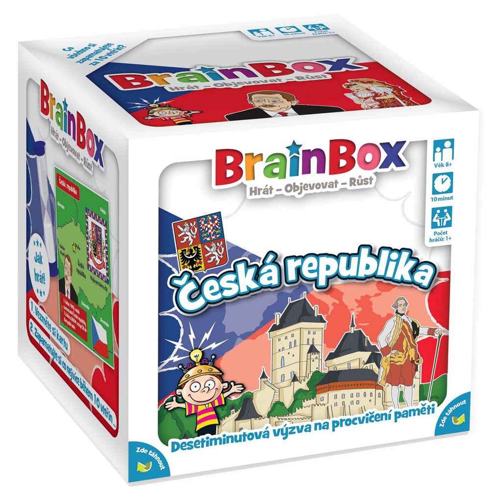 BrainBox je zábavná paměťová a postřehová karetní hra, která otestuje váš smysl pro detail. Co si zapamatujete za pouhých 10 vteřin? Vydání hry zaměřené na Českou republiku představuje kraje, oblasti, slavné osobnosti a mnoho dalšího z České republiky.