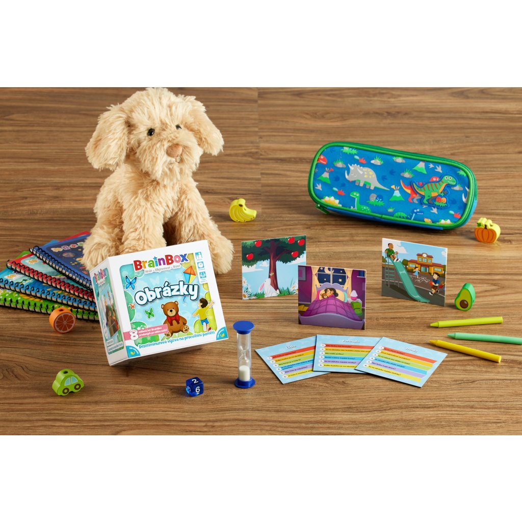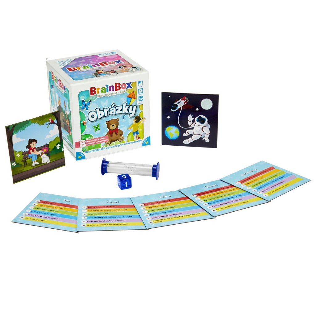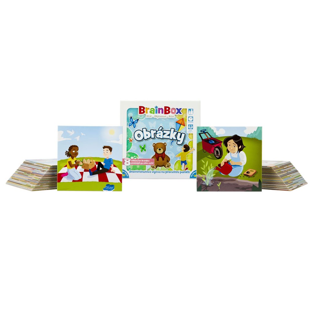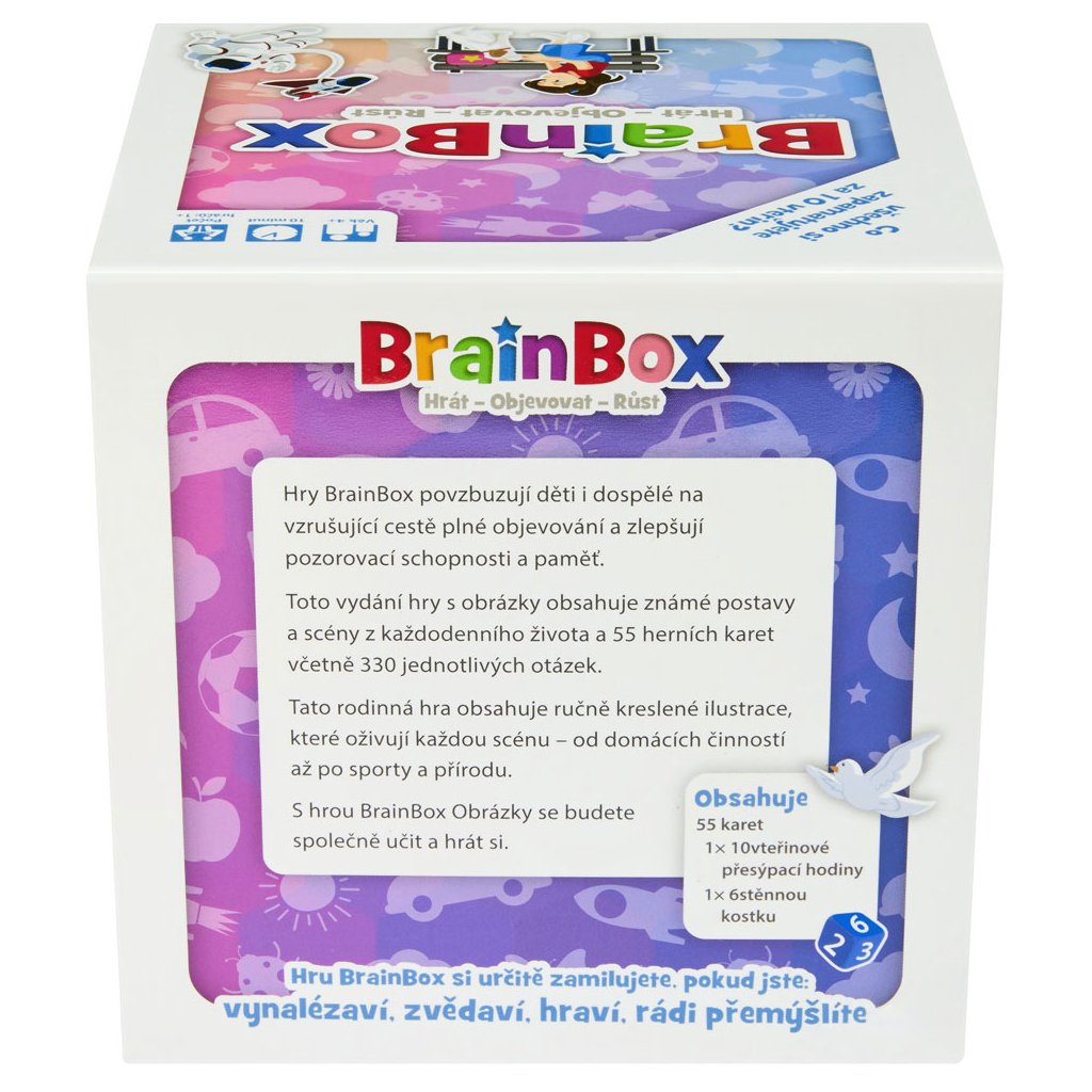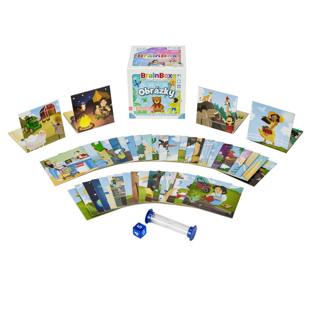 Hra BrainBox Obrázky obsahuje 55 hracích karet s ručně malovanými ilustracemi, které oživují každou scénu, od domácích činností až po sport a přírodu.