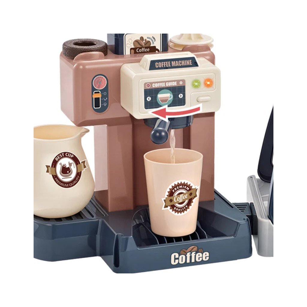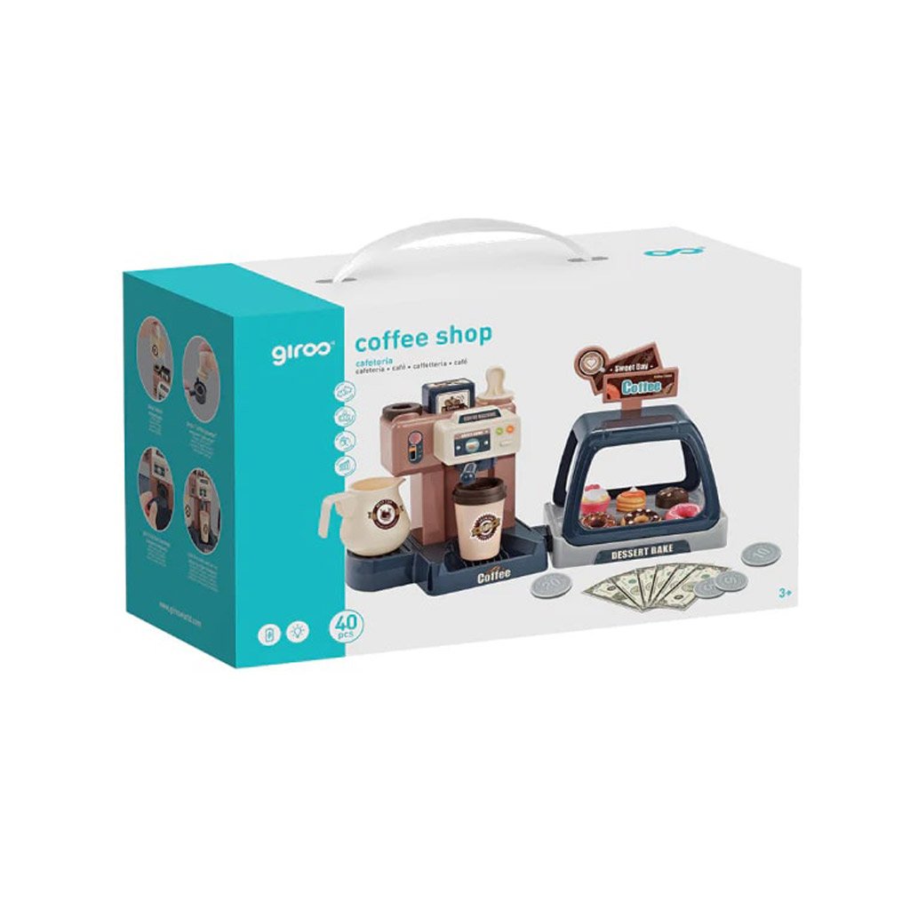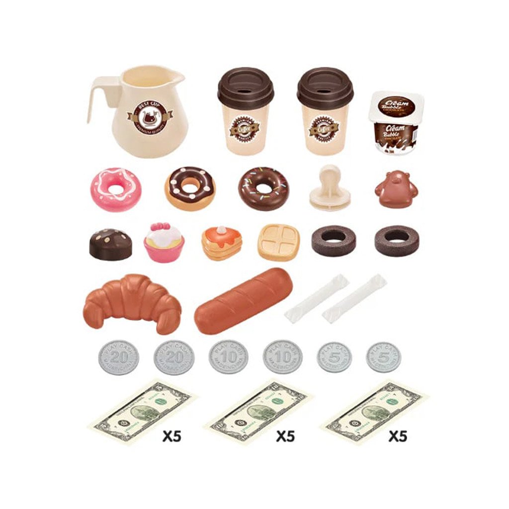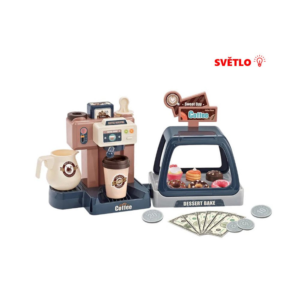 Sada kávovaru na batérie a vitrínky na torty na hru na cukráreň alebo kaviareň. Sada obsahuje 40 ks príslušenstva - kávovar s nádržkou na vodu, šálky a nástroj na lisovanie kávy, mince a bankovky, pokladňu a stojan na zákusky, interaktívna hračka so zvukmi a svetlami, funkcia zapnutia, vypnutie na prípravu nápoja.