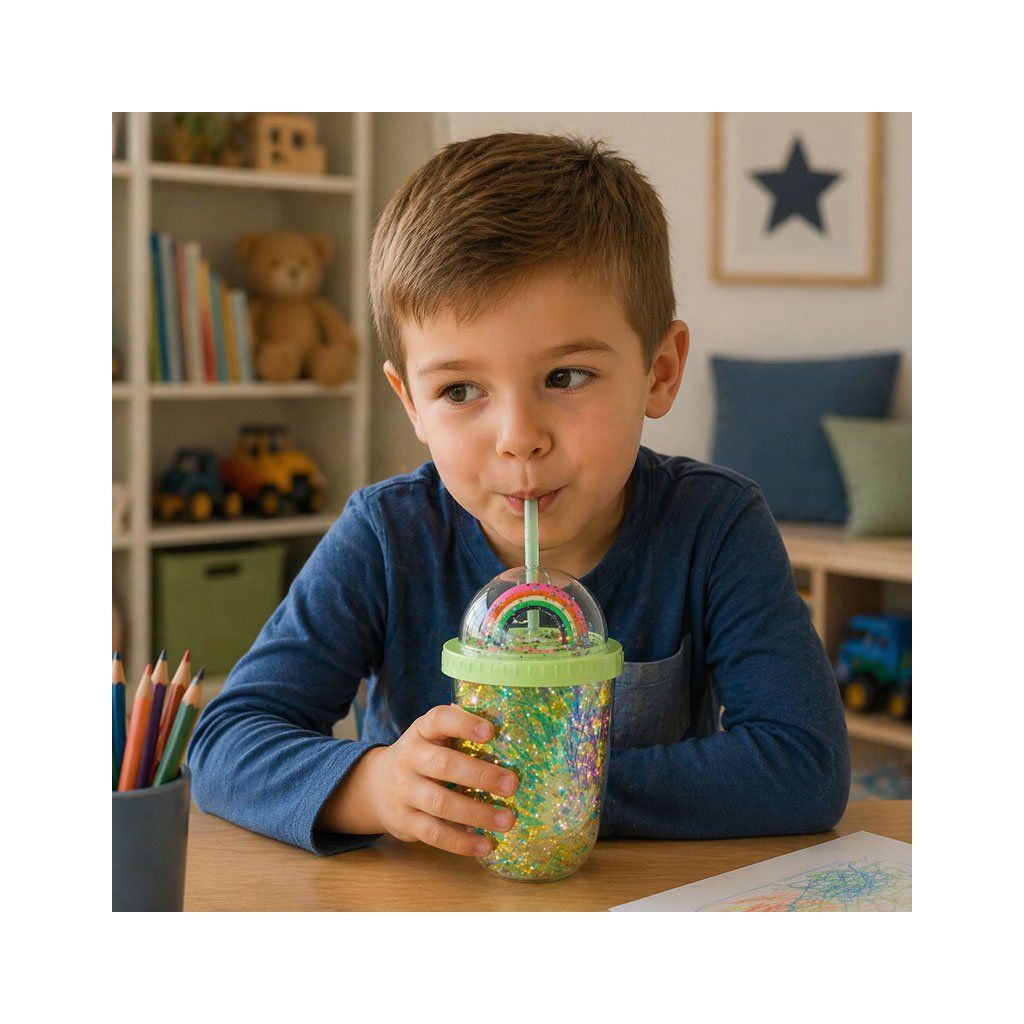 Štýlový a hravý kelímok, ktorý si deti okamžite zamilujú. Vďaka svojmu originálnemu dizajnu s trblietkami a farebným motívom dúhy premení každé pitie na zábavu.