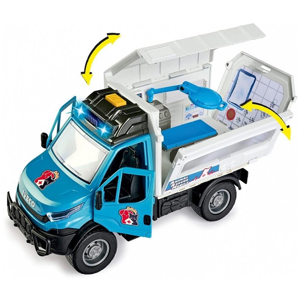Pojazdná veterinárna ambulancia IVECO so zvukovými a svetelnými efektmi. Rozlož si pojazdnú ambulanciu, rozlož si stôl, ktorý sa otáča, ordinačnú lampu a začni vyšetrovať. Balenie obsahuje ohybnú figúrku, 2 psíkov, 1 mačku a príslušenstvo.