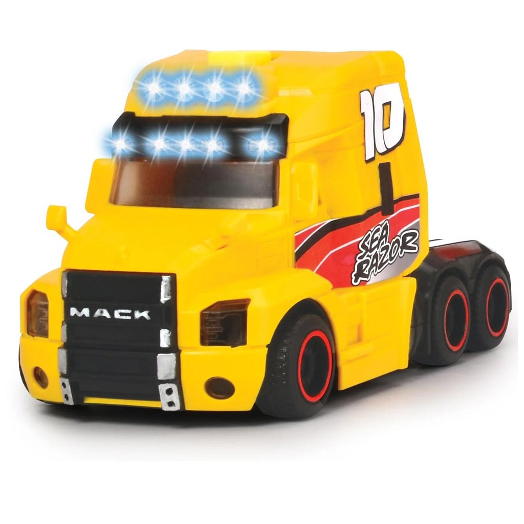 Nákladné auto s funkciou ťažného vozidla na prepravu člnov. Dopravený čln spusti na vodu, zapni motor a plávaj. Autíčko má priehľadné čelné sklo, ktoré ti umožňuje vidieť interiér kamiónu. Má svetelnú a zvukovú funkciu.