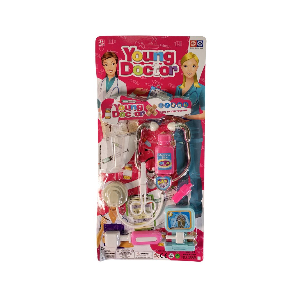 Krásna sada pre malú doktorku alebo sestru. Sada obsahuje stetoskop, nožnice, nádobku, kladivko a ďalšie potreby.