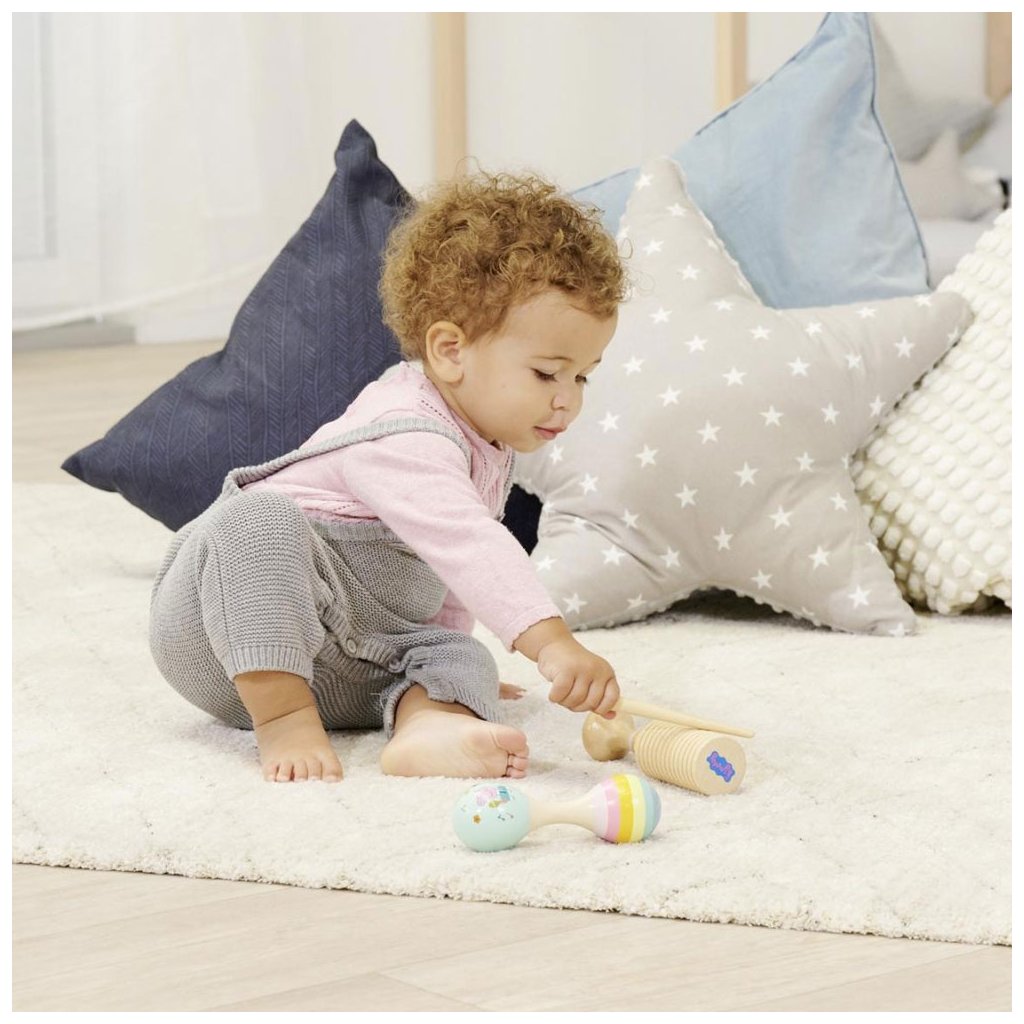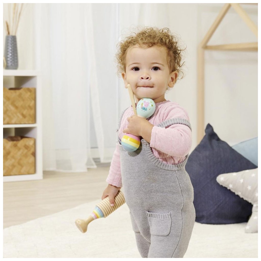 Súprava drevených hudobných nástrojov od Prasiatka Peppy. S drevenou hudobnou sadou Peppa Pig sa deti môžu stať hudobne aktívnymi a spoznať svet hudby. Set obsahuje aj rumba guľu.