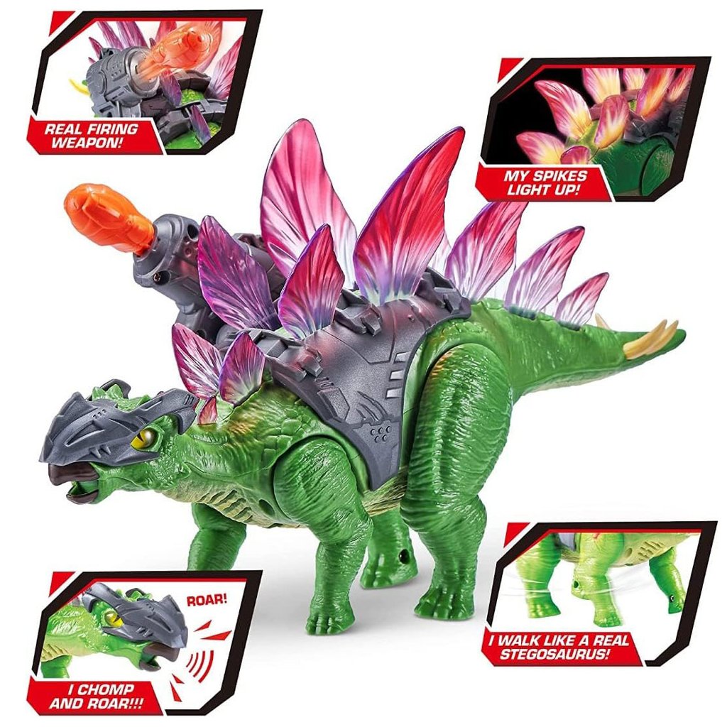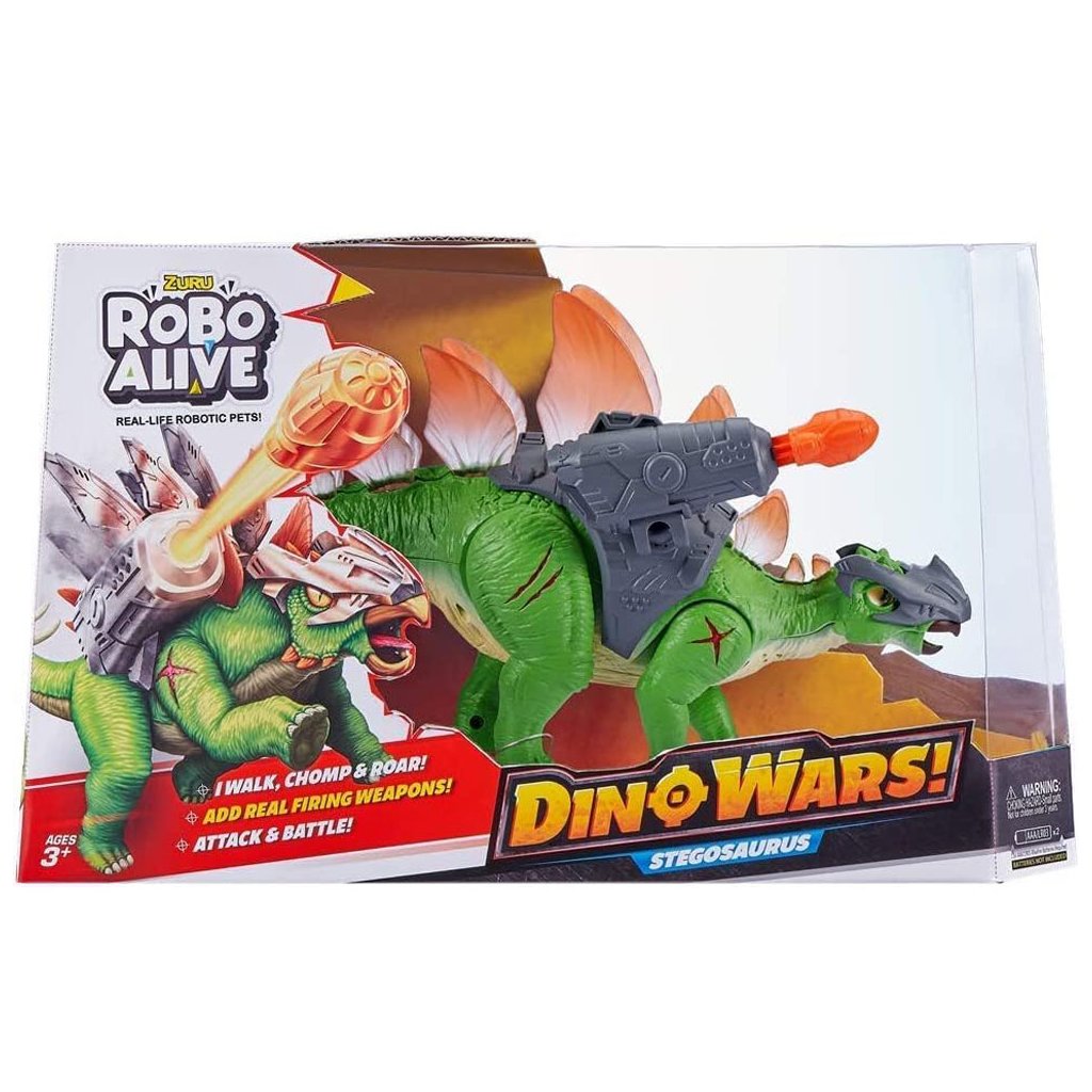 Priamo z prehistorických čias vstupuje do najnovšej sady Zuru Robo Alive Dino Wars nezastaviteľný Stegosaurus. Hoci je bylinožravý, tento legendárny dinosaurus budí strach v iných dinosauroch vďaka červeným doskám na chrbte, jazvám svietiacim v tme a modernému brneniu v podobe strelami!