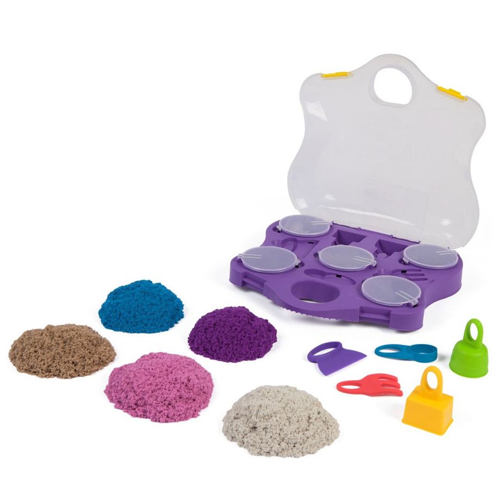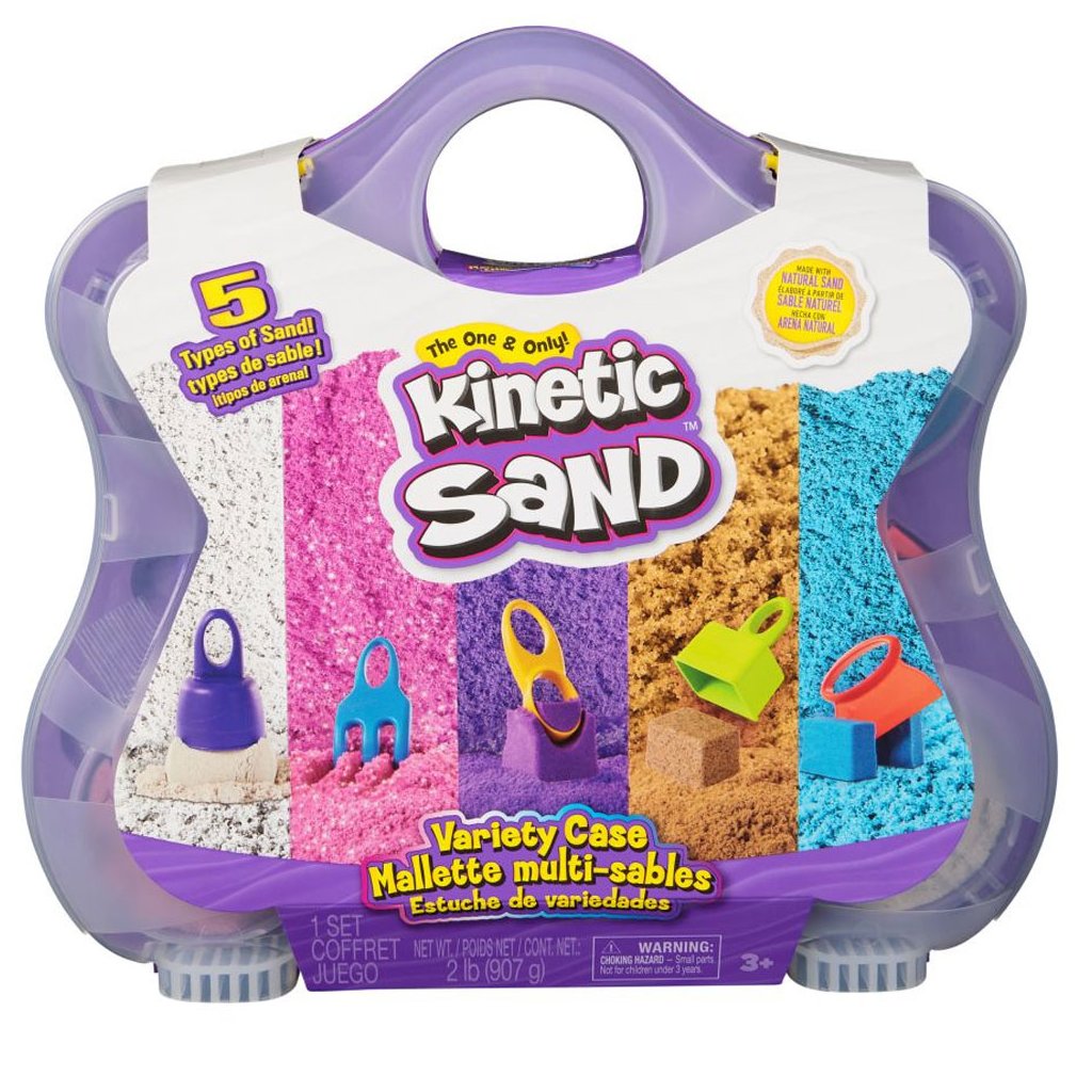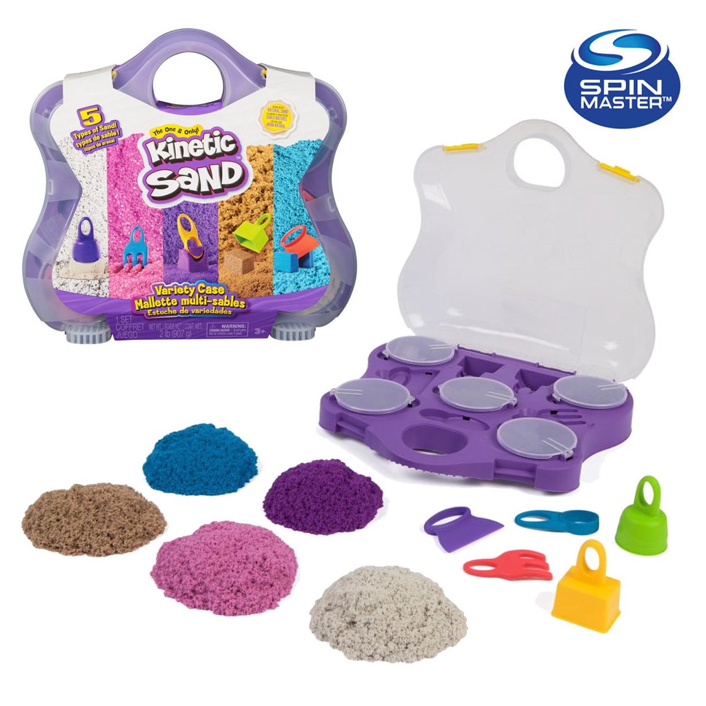 Variety Case! Táto sada kinetického piesku podnieti detskú predstavivosť a kreativitu: deti môžu tvarovať, sypať a robiť bábovky z 3 druhov kinetického piesku v 5 farbách (0,9 kg), a to pomocou 5 nástrojov!