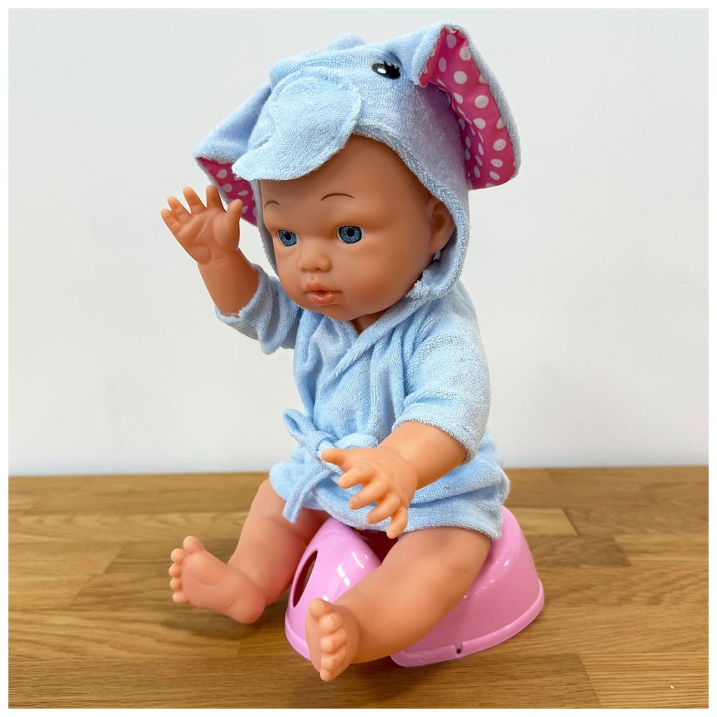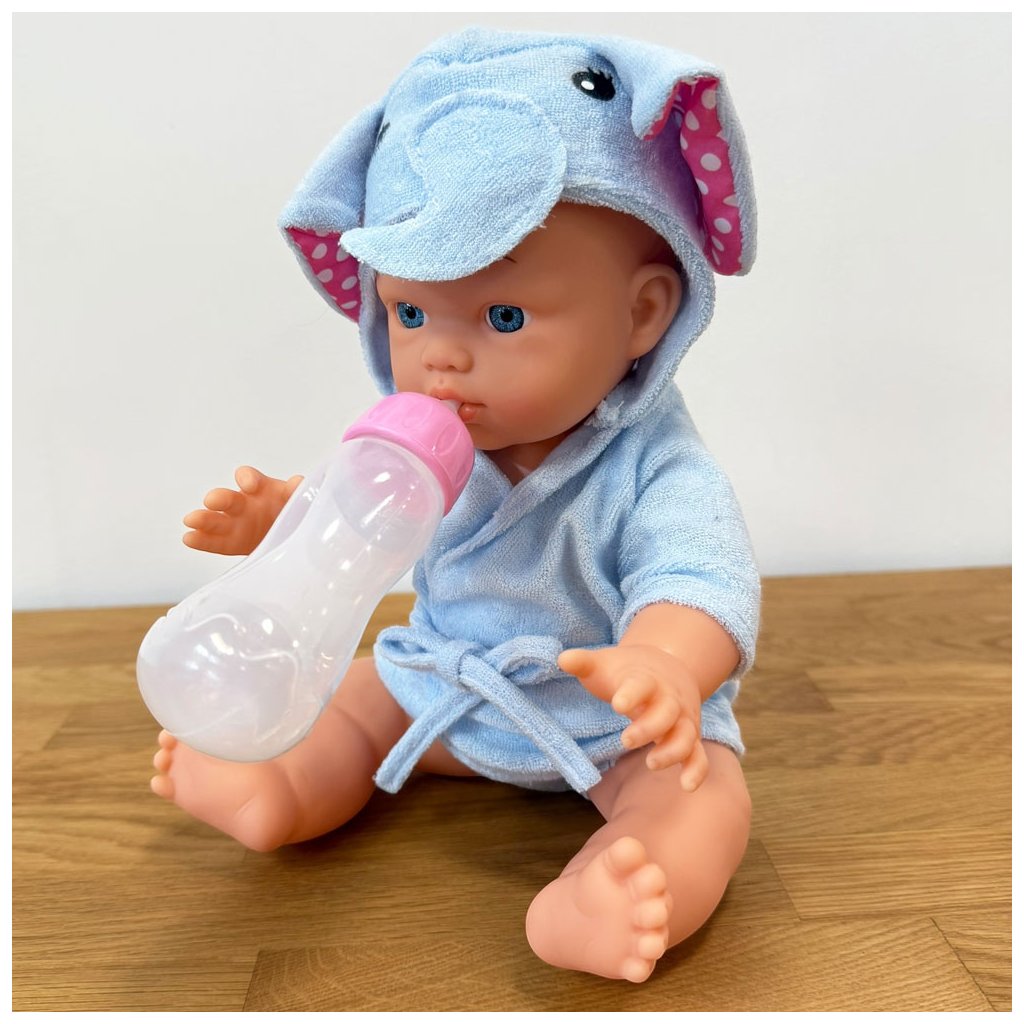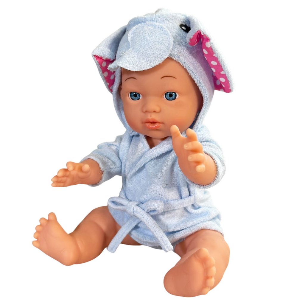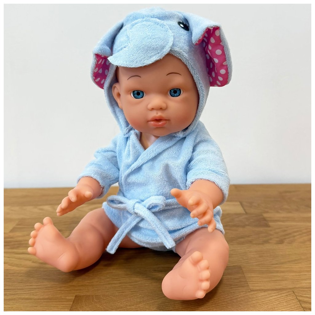 Kúpacia bábika v župane v tvare slona sa stane dokonalým spoločníkom každého malého dievčatka. Pije z fľaše a chodí na nočník. Bábika pije z fľaštičky a ciká. V balení nájdete krásnu bábiku v župane s čiapočkou v tvare slona, nočník, fľaštičku na pitie, cumlík, fľaštičky na mydlo a šampón a kúpaciu žinku.