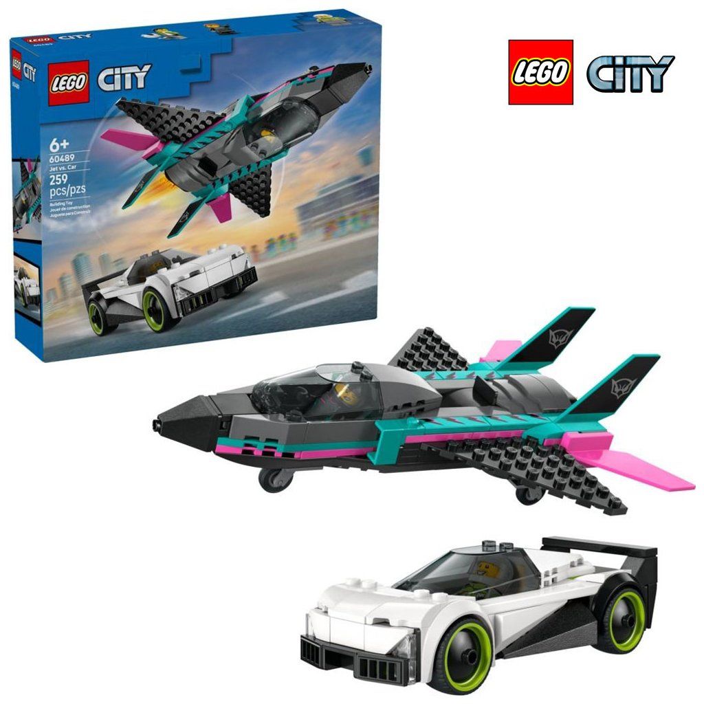 Dvojitá stavebnica LEGO® City Tryskáč vs. auto (60489) obsahuje elegantné superšportové auto a nadzvukové lietadlo, s ktorými si malí stavitelia užijú hodiny pretekania.