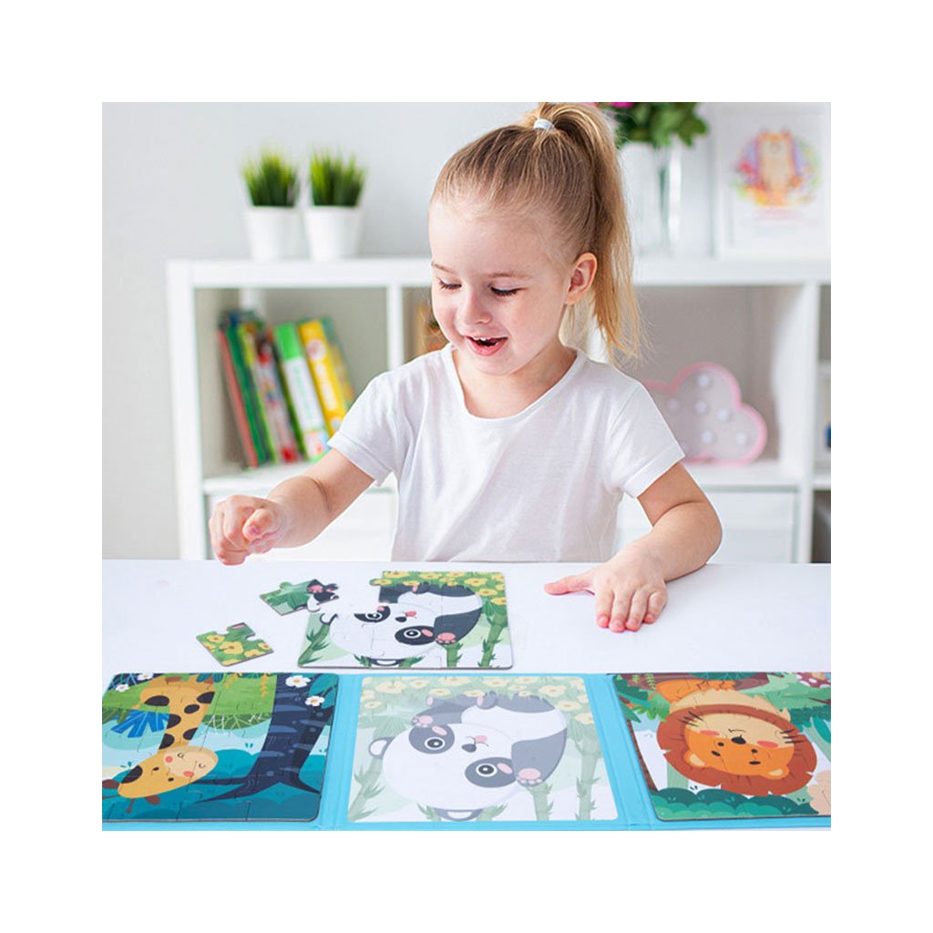 Krásny set troch rozkladacích puzzle v kartónovej knižke. Knižka ukrýva tri puzzle rôzne úrovne puzzle pre deti rôznych vekových skupín. Puzzle sú magnetické, takže na ploche skvele držia a sú vhodné na doma aj na cesty.