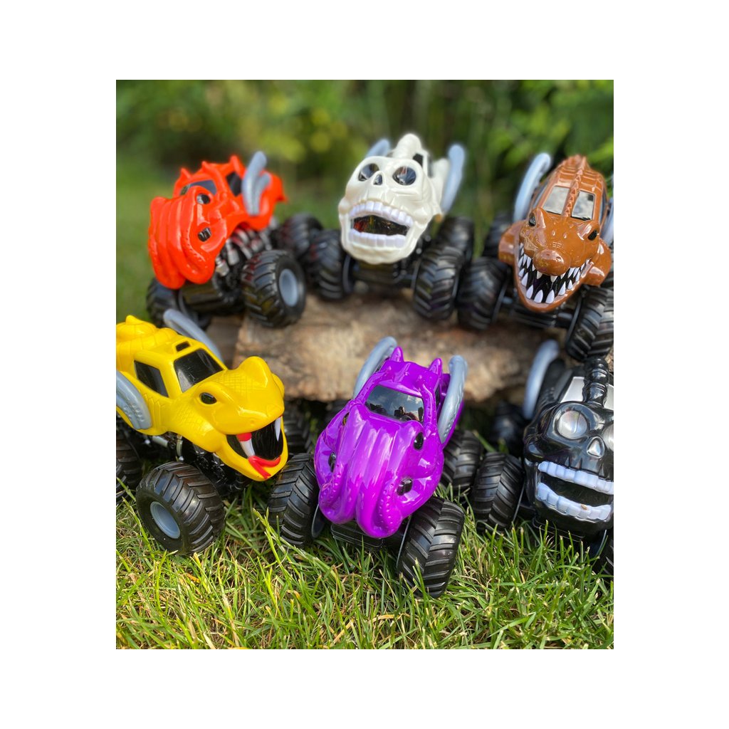 Parádny monster Truck s veselou tvárou jazdí na zotrvačník. Auto je veľké 13 centimetrov.