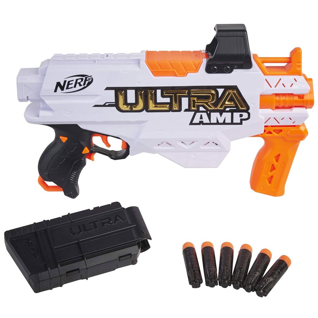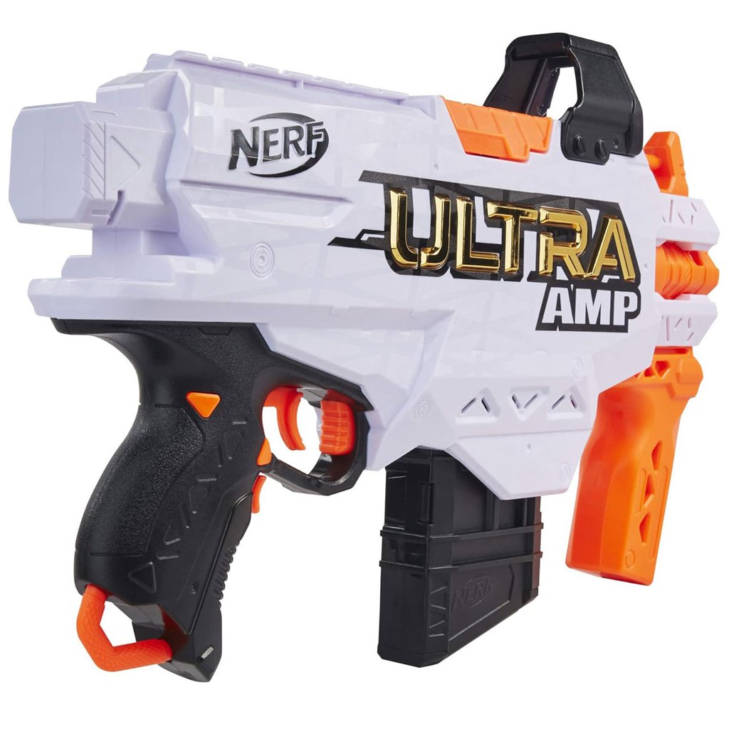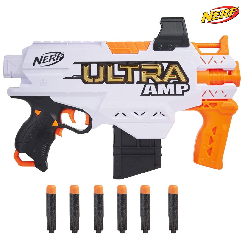Zapnite motor podržaním tlačidla zrýchlenia a stlačením spúšte pošlite na svoje ciele vždy 1 šípku. Blaster Nerf Ultra Amp má integrovaný zameriavač, pomocou ktorého môžete presne zamieriť svoje výstrely. Blastery Nerf Ultra posunú vašu hru na ďalšiu úroveň vďaka svojmu pokročilému dizajnu a výkonu, ktorý poskytuje extrémnu vzdialenosť až 36 metrov, presnosť a rýchlosť.