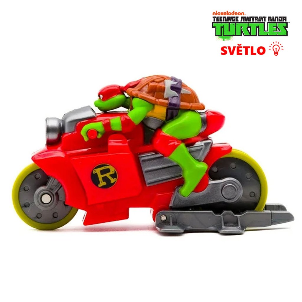 Ninja Korytnačky prinášajú motorky s figúrkou na zotrvačník. Po stlačení tlačidla motorke svieti svetlo. Navyše má systém click. Jednoducho zacvaknite rameno motocykla do správnej polohy a rozbehnite ho. Uvoľnite a sledujte, ako jazdec predvádza salto vzad priamo pred vašimi očami!