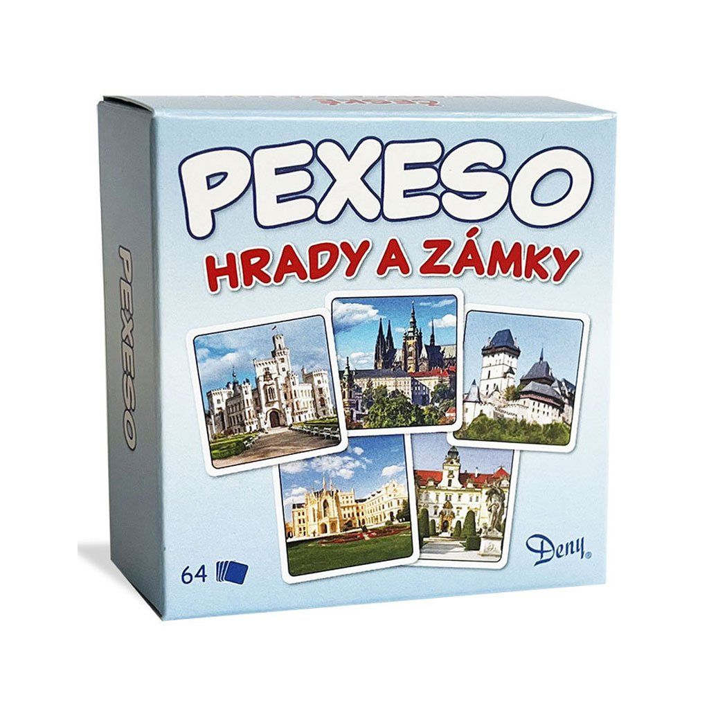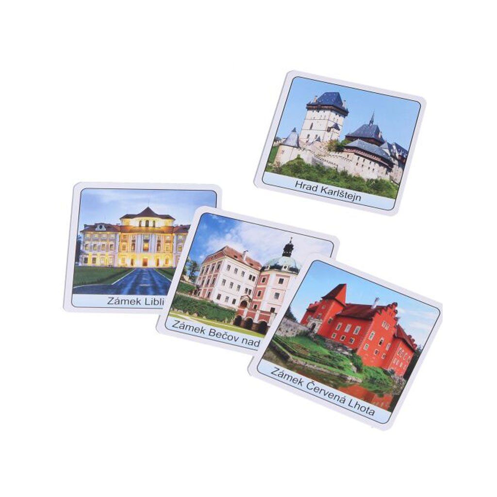 Pexeso Hrady a zámky v krabičke. Balenie obsahuje 64 kariet (32 párov) + 2 karty s pravidlami.