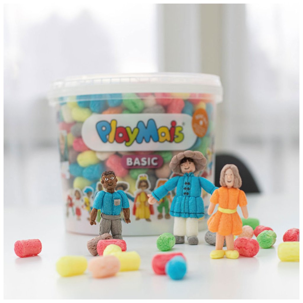 V balení stavebnice Playmais nájdeš na zostavenie figúrky a predtlačené karty s rôznymi úlohami. Stavebnica vo vedierku obsahuje približne 500 dielikov.