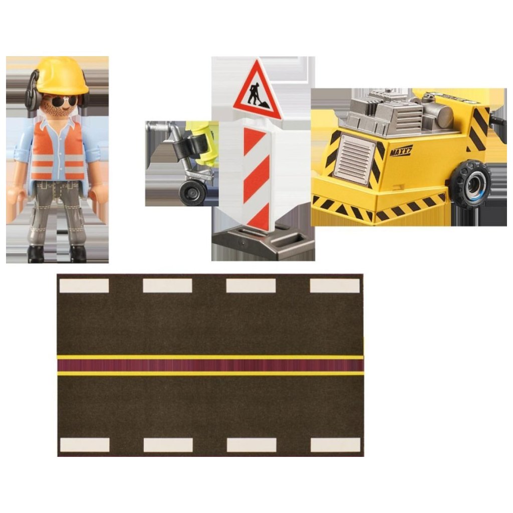 Obsah balenia: 1 stavebný robotník, 1 fréza, 1 natierač pruhov, 1 značka staveniska, 2 cesty