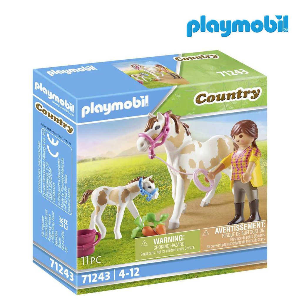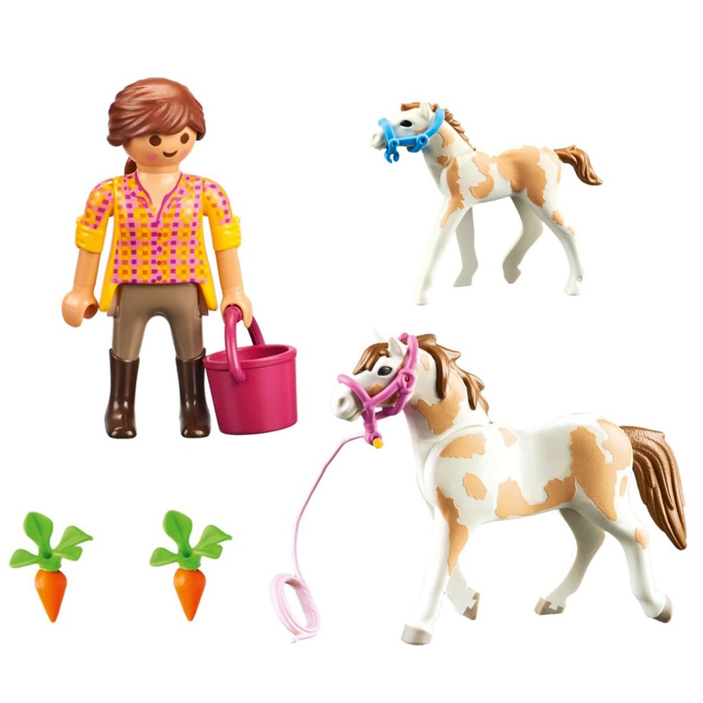 Sada sa skladá z figúrky PLAYMOBIL, Pinto koňa s žriebäťom, ohlávky, oťaží, vedra a mrkvy. Táto konská súprava je ideálna ako malý darček alebo suvenír pre fanúšikov koní a pre rozšírenie sveta PLAYMOBIL Country.