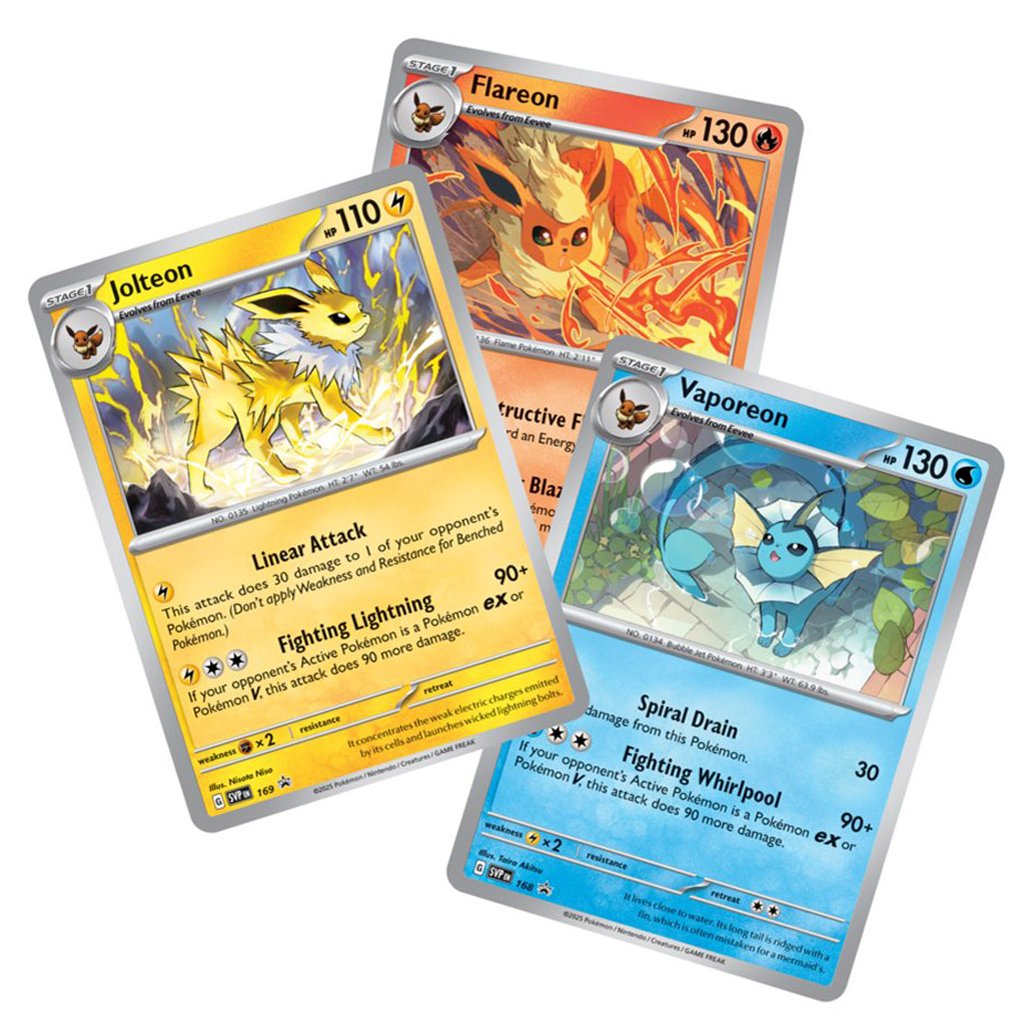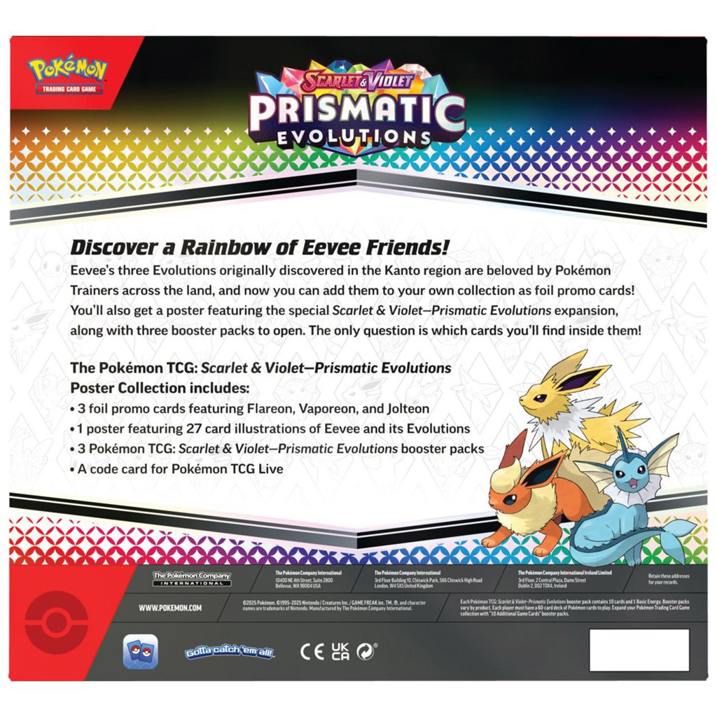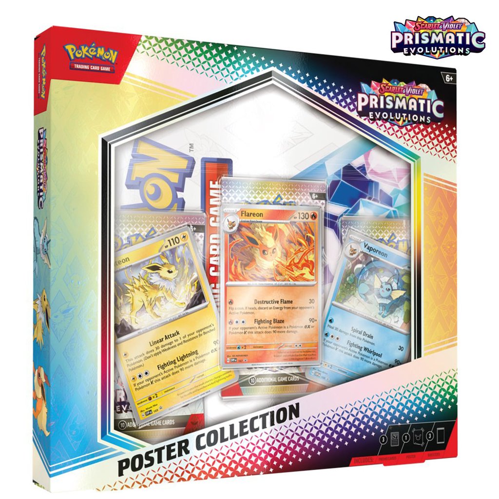Poster box obsahuje obojstranný plagát, ktorý nesmie chýbať na stene žiadneho správneho trénera Pokémonov. Okrem toho tu nájdete 3 balíčky Pokémon Prismatic Evolutions a 3 foilové promo karty Pokémonov Flareon, Vaporeon a Jolteon.