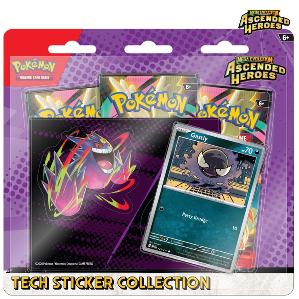 Pokémon Ascended Heroes Tech Sticker Collection - Gastly obsahuje 3 booster balíčky Pokémon kariet, samolepku a promo kartu.