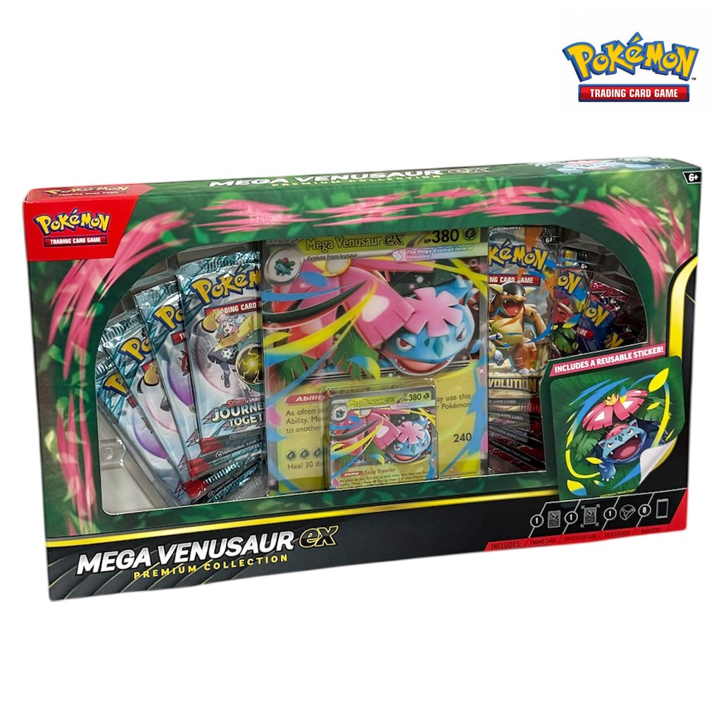 Predstavujeme Mega Venusaur ex Premium Collection – špeciálnu kolekciu zameranú na jednu z prvotných Mega Evolúcií, mocného Mega Venusaura ex! Táto Premium kolekcia je navrhnutá pre zberateľov, ktorí si cenia klasických Pokémonov a chcú do svojej zbierky pridať silnú kartu typu Grass. Získajte osem boosterov a jedinečnú 3D lentikulárnu kartu, ktoré zaručene obohatia vašu zbierku.