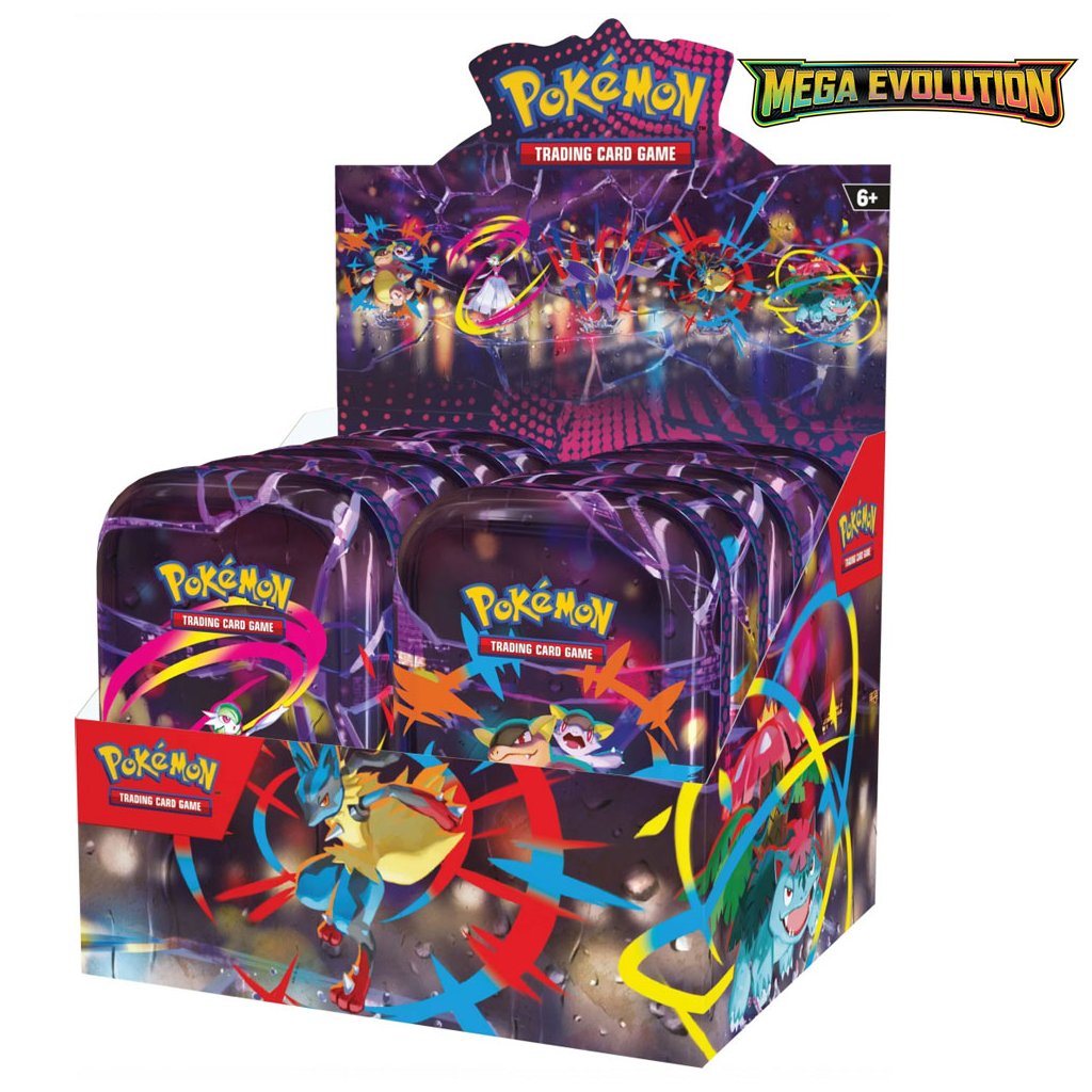 Pokémon TCG – Mega Heroes Mini Tin Display je kompletné balenie zberateľských plechových krabičiek s motívmi populárnych Pokémonov. Každá tin krabička ukrýva boostery a doplnky pre kartovú hru - ideálna voľba pre tých, ktorí chcú rozšíriť svoju zbierku naplno a mať celú sadu štýlovo pohromade.