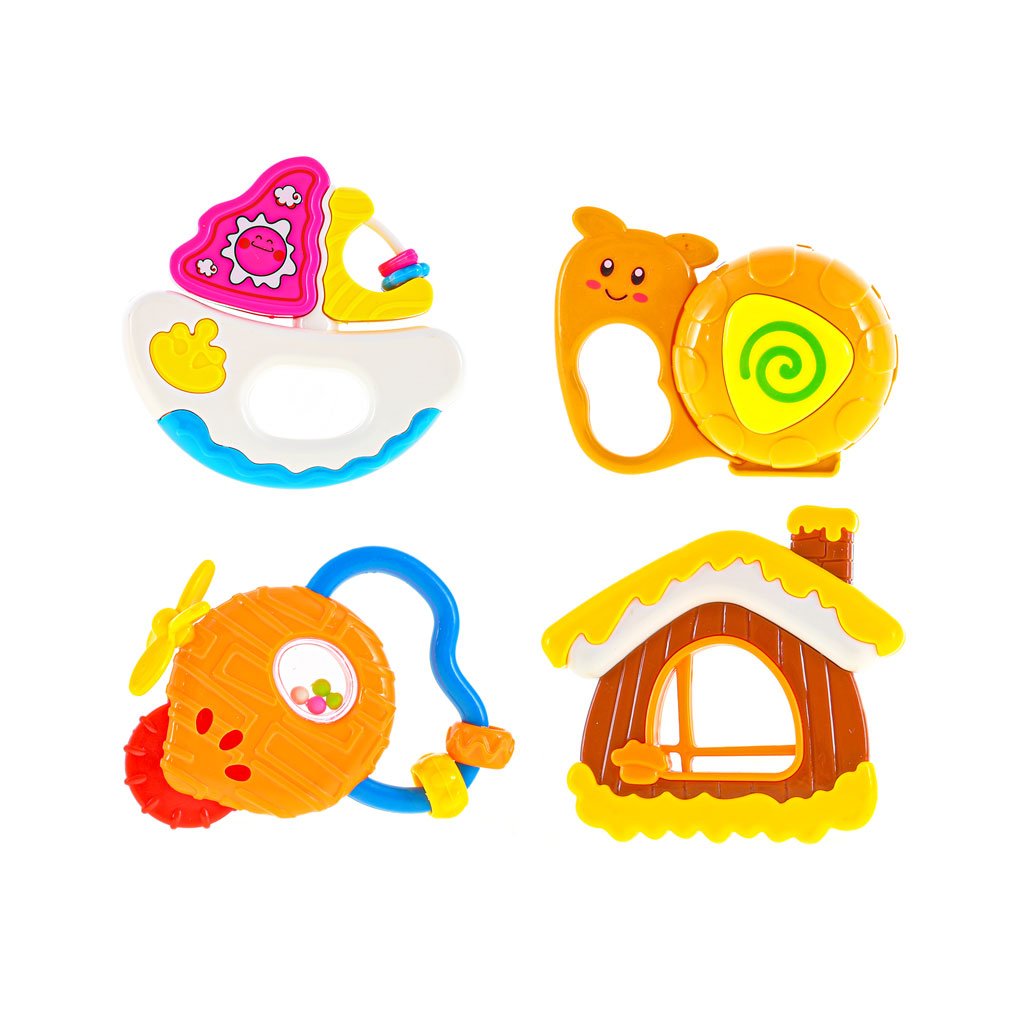 Hrkálka je odjakživa obľúbená hračka tých najmenších. Hrkajúci zvuk deti upokojuje, navyše sa dieťatko učí vnímať a spracovávať okolité podnety. Hračky pre bábätká majú krásny vzhľad, sú ľahké a navyše fungujú ako aktívne hračky – stimulujú dieťa vizuálne aj prostredníctvom hmatu. V sade nájdete hneď štyri.