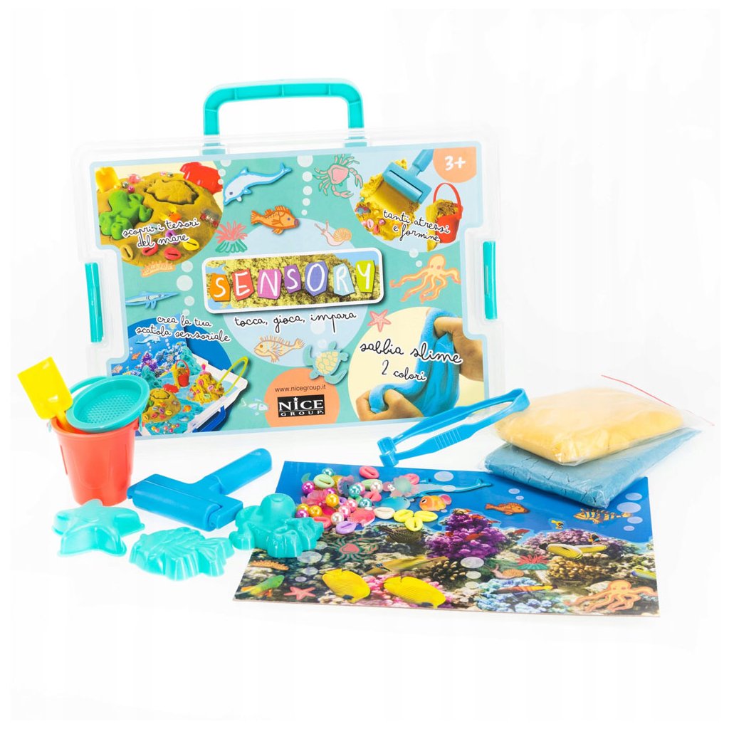 Kufrík plný slizu a doplnkov, aby stimuloval jemnú motoriku a predstavivosť malých detí. Manipuláciou so slizom deti nachádzajú stav pokoja a sústredenia.