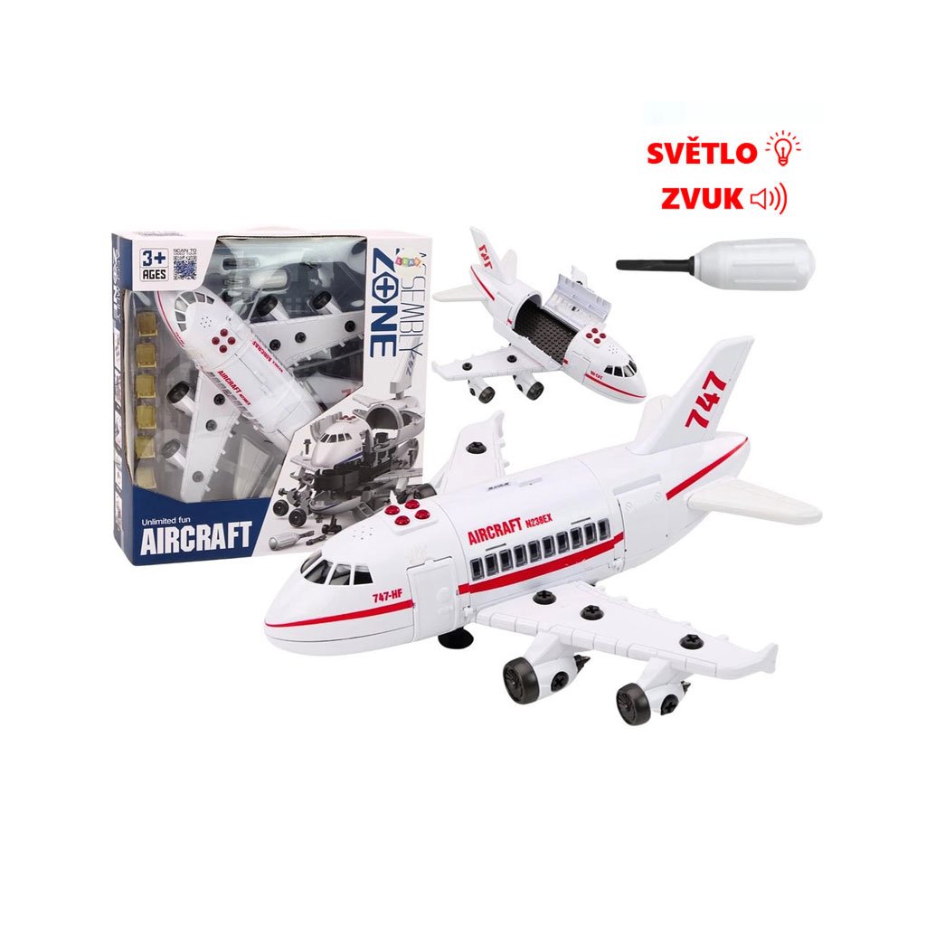 Lietadlo so svetlom a so zvukom. Za pomoci priloženého detského skrutkovača je možné lietadlo rozložiť a zložiť. Po stlačení tlačidla na lietadlo vydáva zvuky. Ideálne pre rozvoj kreatívneho myslenia. Veľkosť lietadla je 45 centimetrov. Svetlo a zvuk fungujú po vložení 3 x 1.5V LR44 batérií, ktoré sú súčasťou balenia.