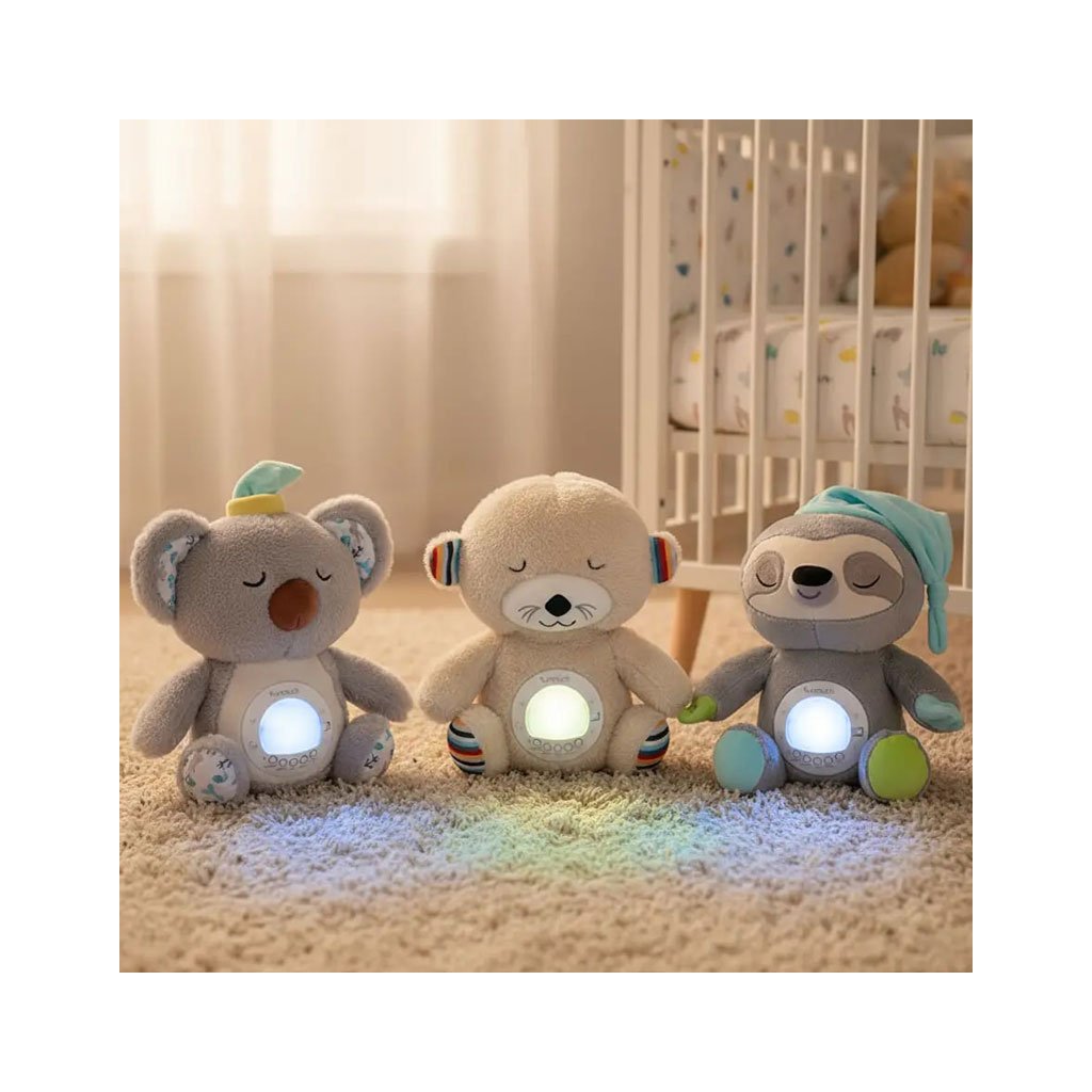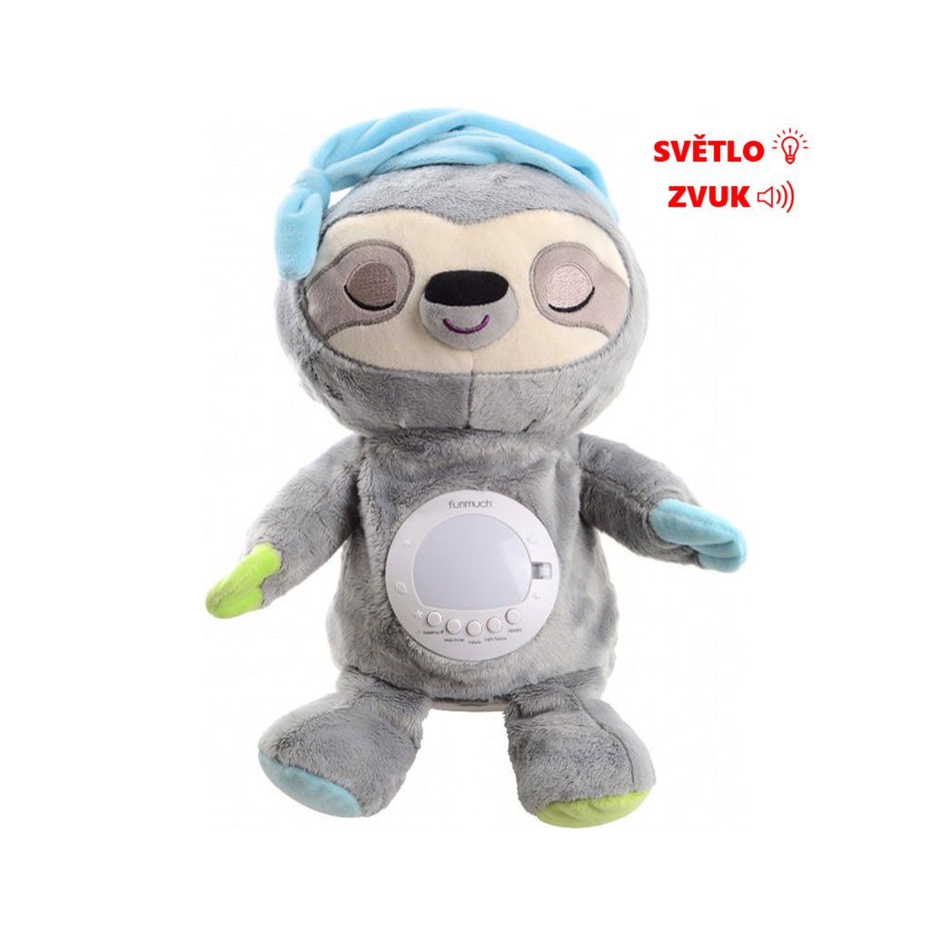 Svetlá menia farbu a ukazujú hviezdy, mesiac a planéty. Celú akciu sprevádza upokojujúca, relaxačná hudba so zvukmi prírody v pozadí. Hračka má niekoľko rôznych uspávaniek. Hudobný box prehráva uspávanky nepretržite takmer 20 minút, takže vaše dieťa má čas krásne zaspať bez toho, aby ste museli uspávanky znovu zapínať a riskovať, že sa vaše dieťatko zobudí. Keď dieťatko zaspí, je možné uspávanky vypnúť pomocou tlačidla na brušku. Leňoch má dve úrovne hlasitosti, takže ho možno dokonale prispôsobiť potrebám dieťaťa.