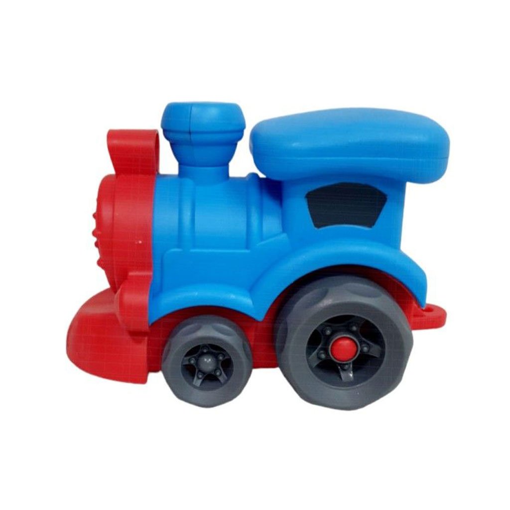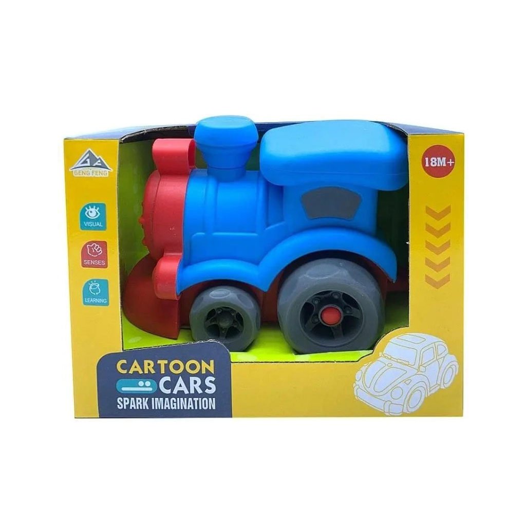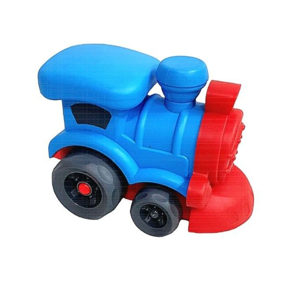 Plastový vláčik z bioplastu na zotrvačník. Vláčik je veľký 12 centimetrov a jazdí na zotrvačník.